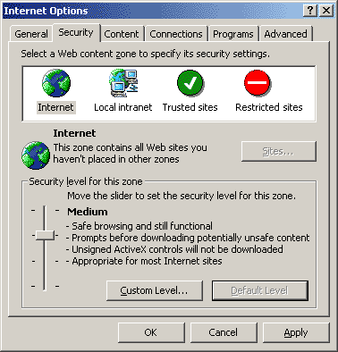 The default security level set for the Internet zone by the Internet Explorer complies with our requirements. If you are using a security setting higher than Medium for the Internet zone you may have problems connecting to or viewing pages on this Site and others.