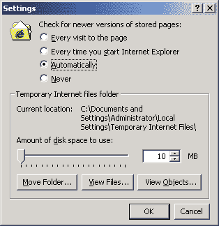 Set pages to automatically load and allocate at least 10 MB of space for temporary internet files